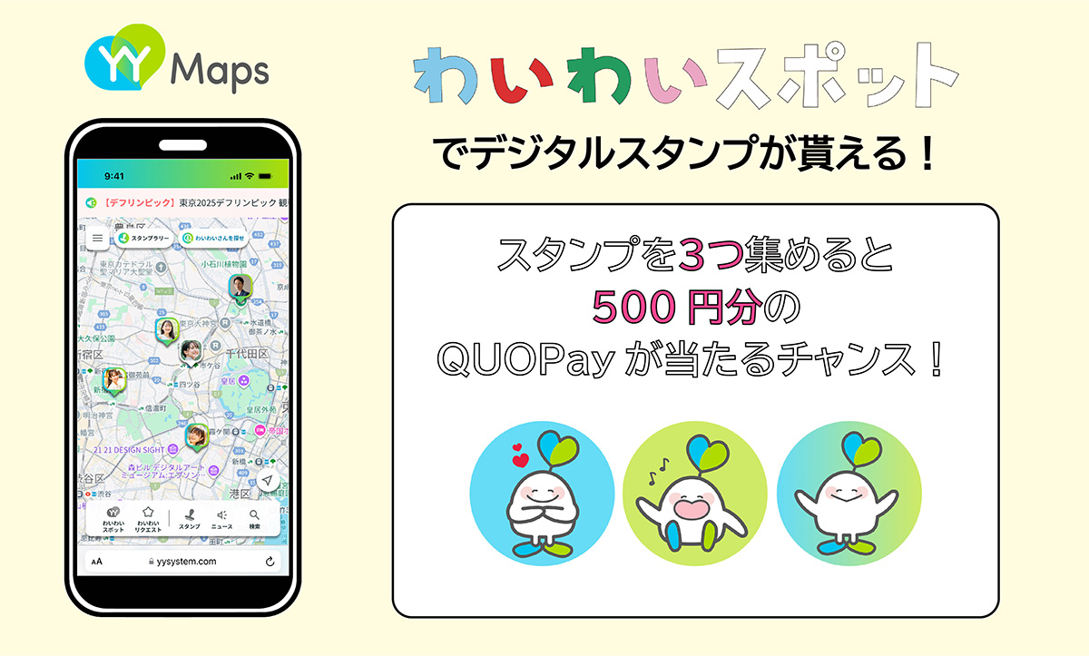 さらに「わいわいスポット」ではデジタルスタンプを貰うことができ、スタンプを3つ集めると500円分のQUO Payが当たるチャンス!ぜひ、デフリンピック観戦や街歩きを楽しみながらご参加ください。