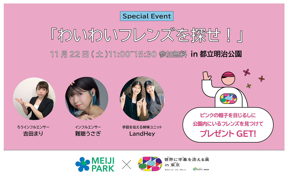1日限定で都立明治公園に『世界に字幕を添える展 in 東京』を応援する「わいわいフレンズ」たちが登場。当日は「わいわいフレンズ」として、ろうインフルエンサーの吉田まりさん、インフルエンサーの難聴うさぎさん、手話を伝える姉妹ユニットのLand Heyさんが参加予定です。フレンズを探して声を掛け、条件をクリアすると限定グッズや都立明治公園で使えるお得なチケットなどがもらえるスペシャルイベントにぜひご参加ください。聞こえ方や言語の違う人同士が楽しみながらコミュニケーションできる機会作りにつなげます。