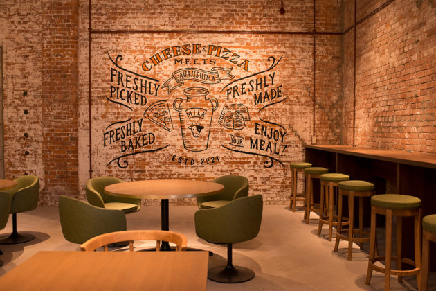このピザレストランでは、地元の農家から毎朝届くミルクを使い、店内のチーズ⼯房で作るフレッシュチーズと地元⾷材を組み合わせた様々なローカルピザを提供しています。