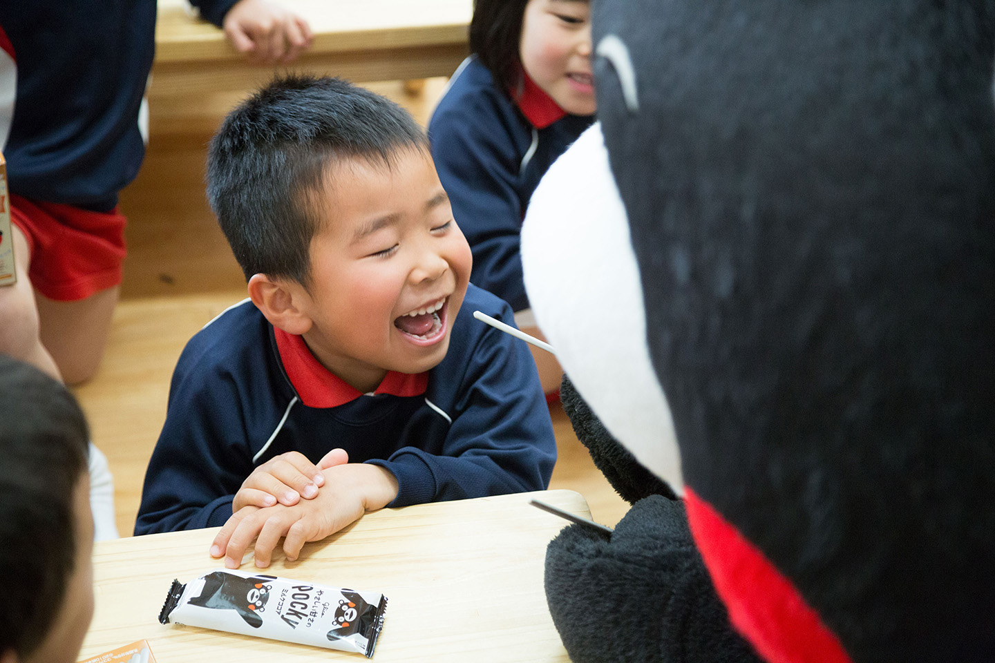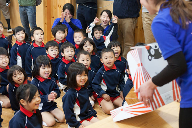 その後、子どもたちは声を上げながら紙芝居を楽しんでくれ、おはなしのあとにはみんなでBOXに入ったお菓子を分け合い…なんとそこに、本物のくまモンが登場するサプライズもはさみながら、笑顔の時間を過ごしてくれました。