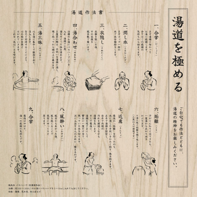 「湯道」では、湯に入る作法として9つの作法を推奨しています。そこで、バスハーブならではのオリジナル作法をつくり、「湯道」コラボレーション限定パッケージとして作法書と手ぬぐいとバスハーブを合わせて販売しました。