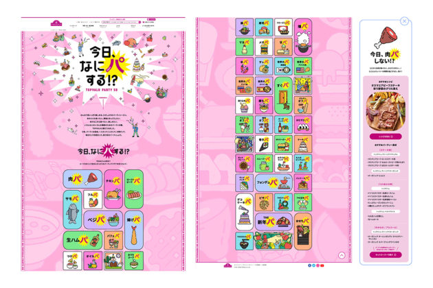 「肉パ」「ベジパ」「デコケーキパ」「アジアンパ」「おせちパ」それぞれ5つのテーマで構成されたテーブルで、オールトップバリュで叶えられるパーティーを可視化し、「今日、なにパする!?」のメッセージを届けました。