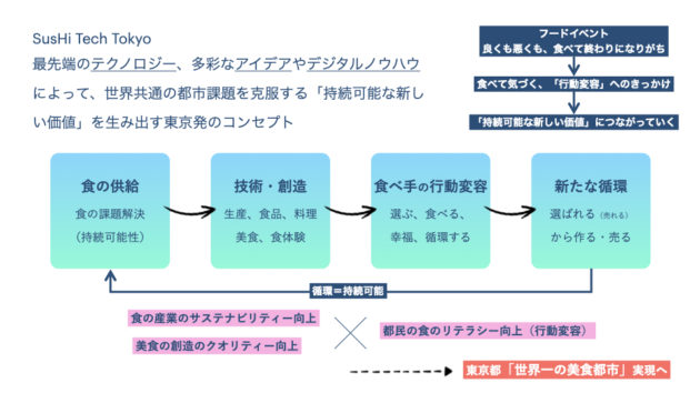東京都が手がける「食のイベント」として、こういうメッセージ性を持ったものは過去あまりなかったのではないでしょうか。 「SusHi Tech Tokyo 2024」の食の考え方を掲げたことで、東京都としてやる意味が明確になり、とても意義があったと感じましたし、手応えも感じました。 「食」は美味しいし、楽しいし、人を惹きつけるものであるので、そのパワーを活かしながら、もうひとつの大切なメッセージを伝えることを今後もやっていけたらと強く思いました。 このイベントは第一歩。 次につながる、継続するような動きを模索し、「食」を通じてよりよい未来に貢献できればと考えています。