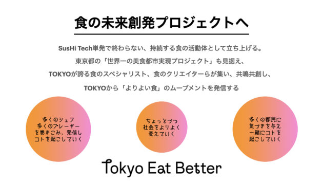 最初に考え方を書いてみた企画書です。 ・東京は世界が注目する食の都であり、星の数が世界一多い都市 ・意識の高い料理人、食の知見者・研究者、食の先端企業が集まっている街 ・全国各地の最高の食材が集まってきて受発信や競争・共創のあるマーケットプレイス ・東京の地産地消/自給率は0に近いですが、全国各地の食に興味を持って消費する圧倒的な食べ手がいる大都市 という認識が日頃からありました。 その一方で、自分の日常の周囲を見てみると、世界的に大きな問題となっている「食の社会課題」については、食業界の方々が取り組み、発信している一方、一般市民レベルになると、あまり注目されていない、自分ごとになっていないとずっと感じていました。 東京都が旗を振り、多くのステークホルダーと都民を巻き込むイベント「SusHi Tech Tokyo 2024ショーケースプログラム」であれば、食の未来をテーマに意義のあることができるのではないか、ぜひやってみたいと思いました。 そこで、最初に提案したメッセージが「Eat Better」です。