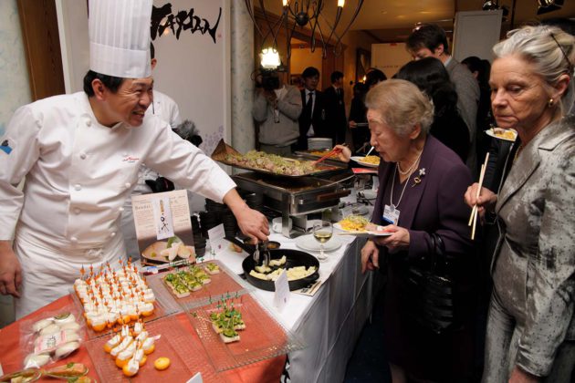 「光の料理」と題され、訪れた各国のゲストをもてなしたのは、世界的に有名な日本の料理人たちによる料理の数々。料理を監修したのは、ロンドンの懐石料理「UMU」の石井義典氏、山形県鶴岡市のイタリア料理の「アル・ケッチャーノ」の奥田政行氏、岩手県奥州市のフランス料理「ロレオール」伊藤勝康氏、洋菓子「パティスリー・サダハル・アオキ」の青木貞治氏など錚々たるスターシェフたち。彼らのディレクションのもと、チューリッヒの日本料理店「BIMI」が協力し、ヨーロッパのソース文化にはない、素材自体の味を引き出す日本独自の調理法でゲストをうならせました。