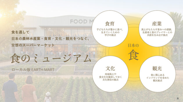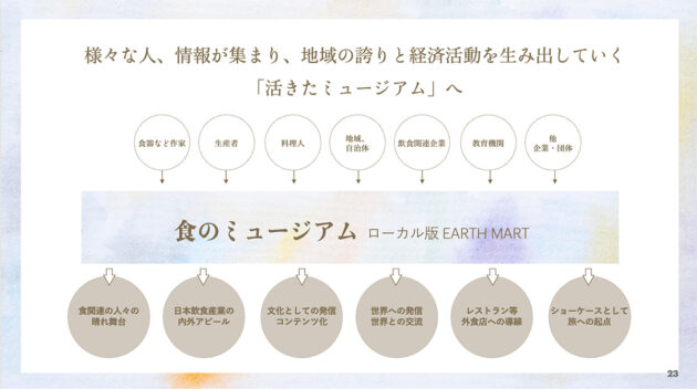 さまざまなステークホルダーに、日本の食を体験してもらいながら、新たな付加価値をもたらす「食のミュージアム構想」として、以下のようなトピックを考えています。