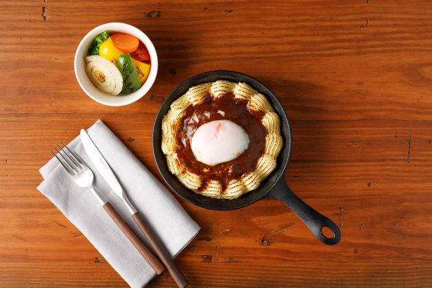看板メニューは、グツグツとしたデミグラスソースに埋もれたハンバーグ。その上にのったトローリ温玉をかめる鉄鍋スタイルで熱々をお召し上がりいただきます。